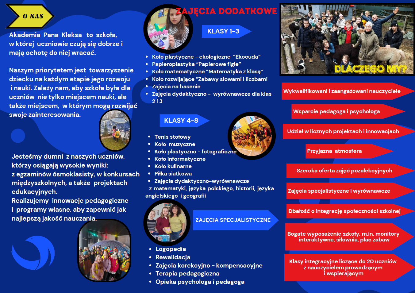 Akademia Pana Kleksa to szkoła, w której chcemy, aby uczniowie czuli się dobrze i mieli ochotę do niej wracać. Naszym priorytetem jest towarzyszenie dziecku na każdym etapie jego rozwoju i nauki. Zależy nam, aby szkoła była dla uczniów nie tylko miejscem nauki, ale także miejscem, w którym mogą rozwijać swoje zainteresowania.