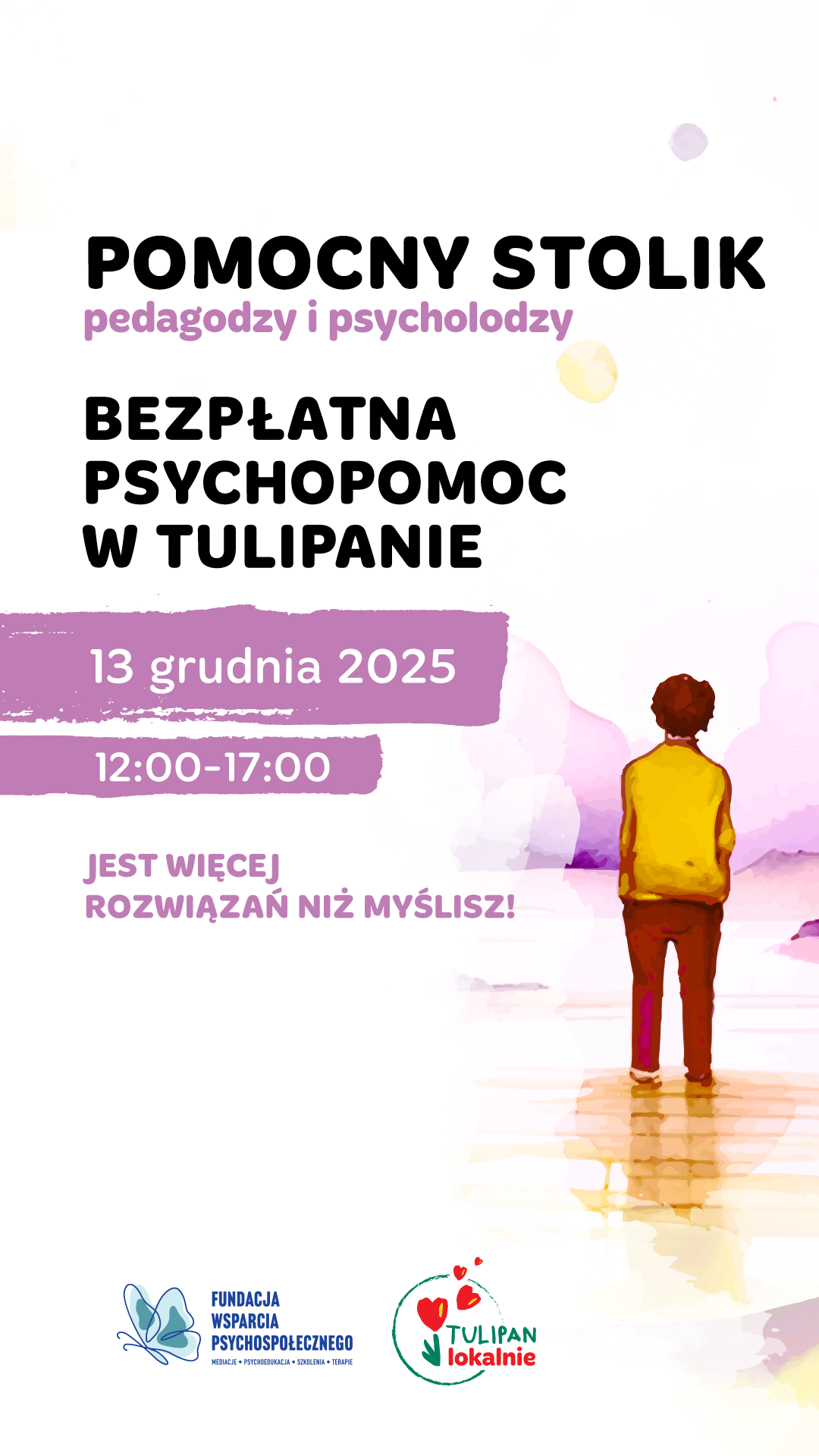 Okres przedświąteczny to czas, kiedy warto porządkować też trudne sprawy, które utrudniają czerpanie satysfakcji z życia rodzinnego. Można podjąć pierwsze kroki na rzecz zmian, jakie pomogą zacząć rozwiązywać problemy małżeńskie, partnerskie czy wychowawcze oraz edukacyjne. Już w najbliższą sobotę 13 grudnia pedagodzy i psycholodzy Fundacji Wsparcia Psychospołecznego będą czekać na łodzian w punkcie „Pomocny Stolik”, cyklicznie organizowanym w Centrum Handlowym „Tulipan” przy al. Piłsudskiego 94. Dyżur trwa w godz. 12 – 17. Spotkania ze specjalistami są bezpłatne. W załączeniu przesyłamy plakat. Więcej informacji można uzyskać pod numerem telefonu 794 430 463. Zapraszamy!